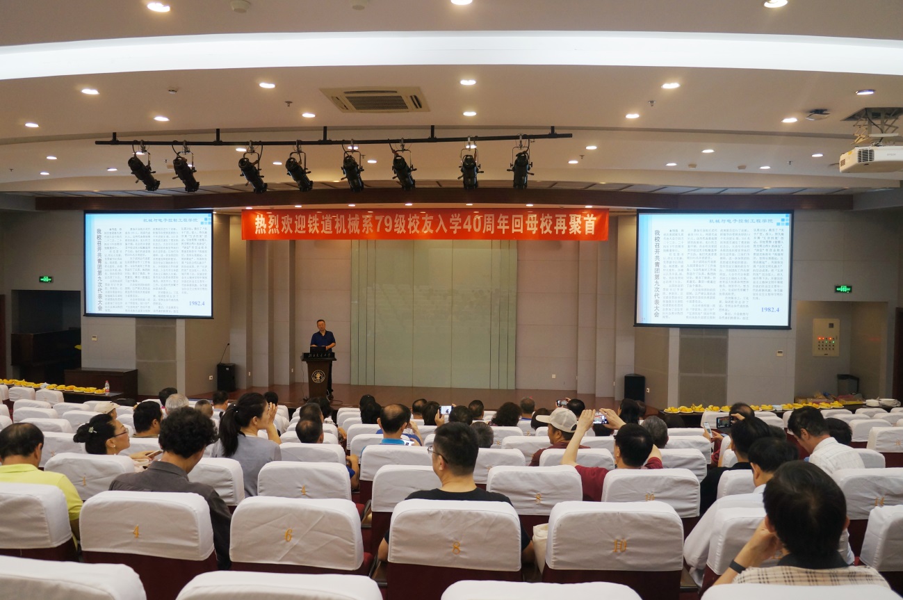上午10点左右,校友们相聚机械楼二层,报到处前一片欢声笑语,同学们互相握手拥抱,气氛浓厚。学院为每一名回来的校友精心准备了报到材料,同时,校友自发设计制作了纪念品。校友们在机械工程楼二层报告厅召开铁道机械系79级校友入学40周年“共话当年”主题座谈会,79级校友、太阳网集团tcy8722党委书记杜永平精心制作了回忆ppt,校友们共同深情回顾了难忘的校园时光和奋斗历程。
