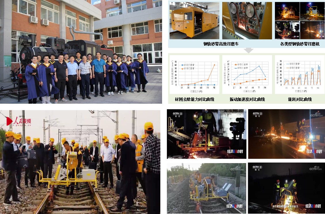 我院先进磨削与精密加工研究所完成的科研项目“国际首台锂电驱动钢轨砂带打磨设备”(完成人:樊文刚、李建勇、刘月明、聂蒙等),针对高速、普速、重载、高原高寒铁路以及地铁、有轨电车等轮轨制式轨道交通系统钢轨养护的复杂特殊需求,首次提出了具有完全自主知识产权的钢轨砂带高效绿色打磨新技术,打破了国外垄断局面。研发形成的设备与传统内燃式砂轮打磨设备相比,可显著提高打磨效率3~5倍以上,同时具有打磨质量好、振动小、噪声小、能耗低、适应海拔4000米以上高原缺氧条件等诸多优点,已广泛应用于铁路和城市轨道交通系统,产生了显著的经济和社会效益,先后被央视CCTV-2《经济半小时》栏目报道。