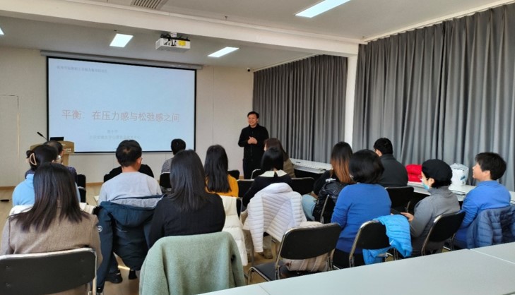 11月17日下午,太阳网集团tcy8722工会组织开展了2023年度教职工幸福力提升活动,活动邀请了我校心理素质发展中心副主任鲁小华教授以“平衡:在压力感与松弛感之间”为主题做专题讲座。校工会张兰老师出席活动,学院近30名教职工参加活动。