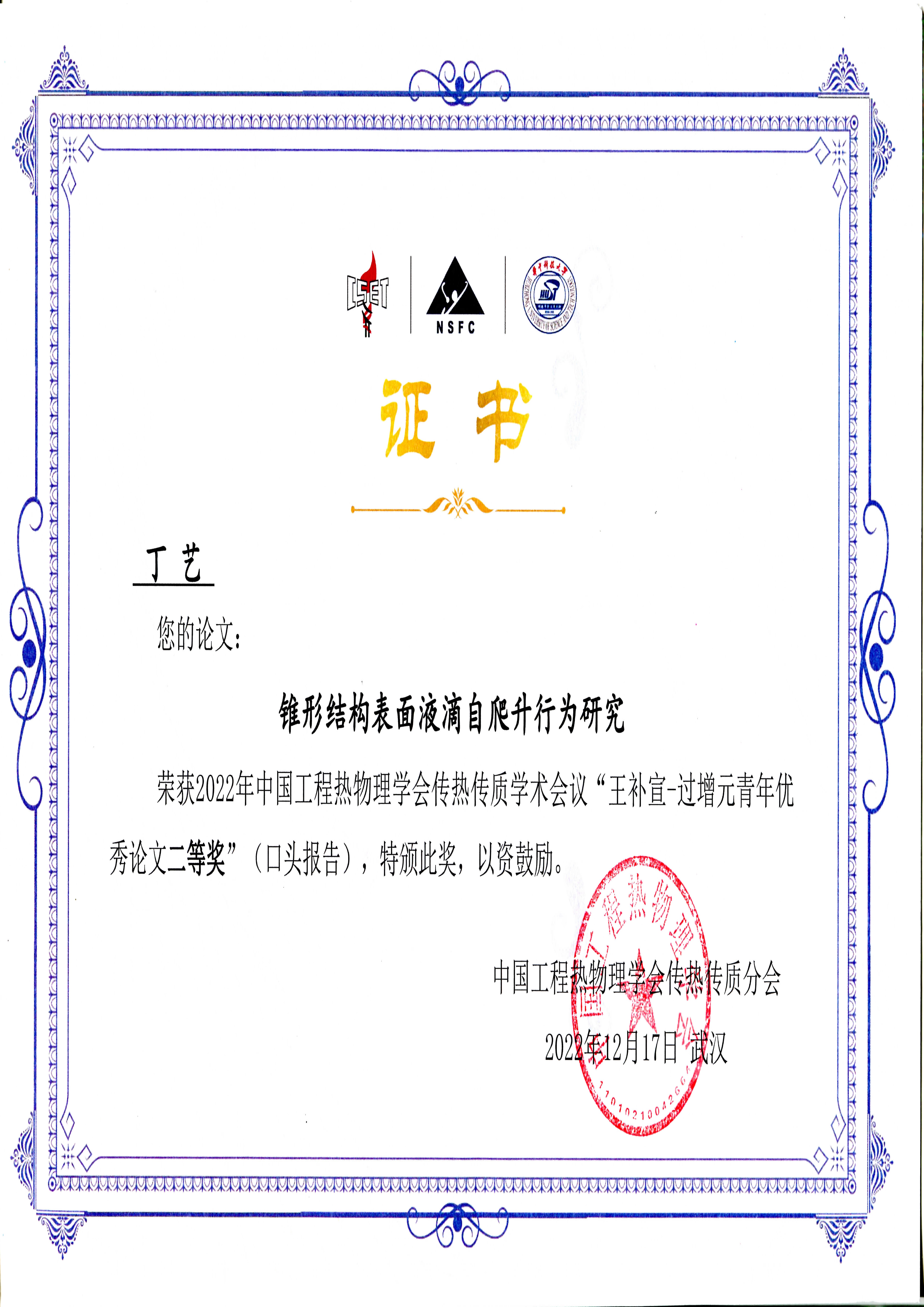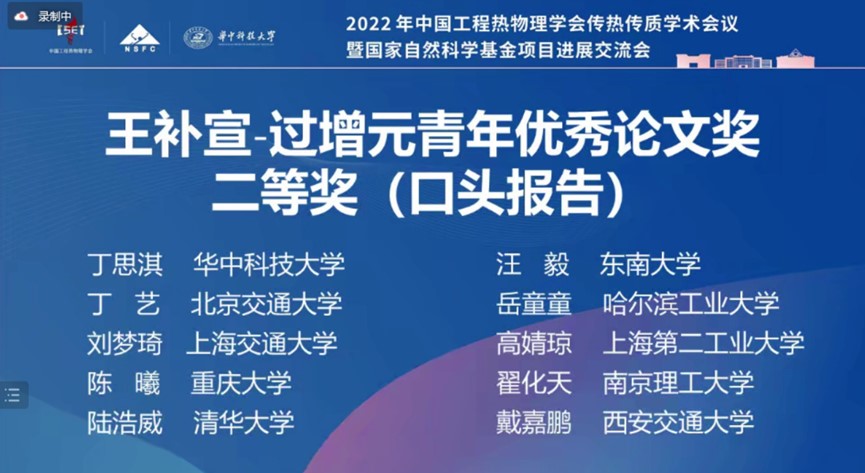 2022年12月16-18日,2022年中国工程热物理学会传热传质学术会议暨国家自然科学基金项目进展交流会于线上召开。我院2018级博士研究生丁艺的论文《锥形结构表面液滴自爬升行为研究》荣获“王补宣-过增元青年优秀论文奖”二等奖(口头报告)。