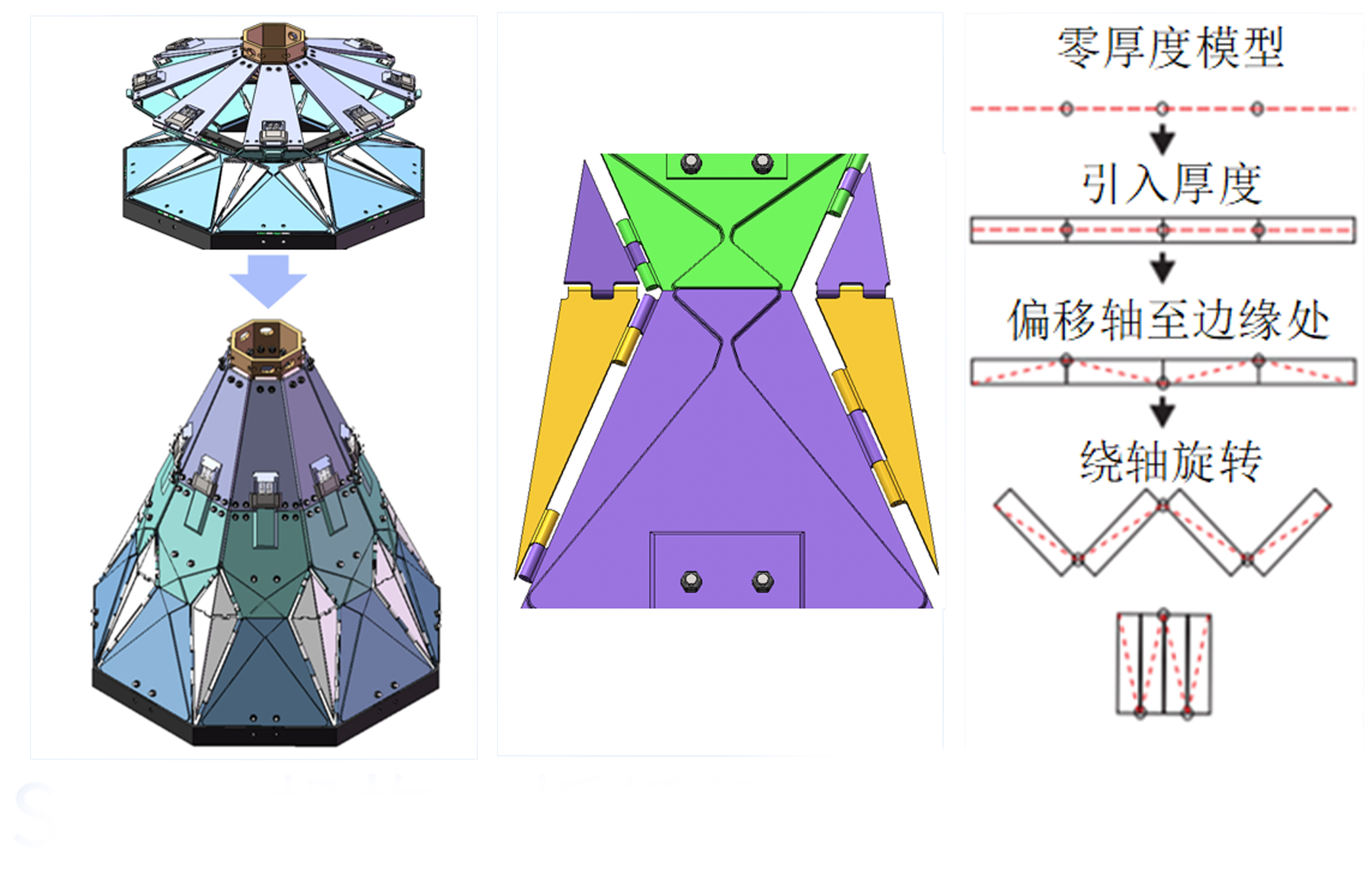 梅依流同学的毕业设计《基于Sarrus机构的延伸喷管构型设计与研究》针对当前延伸喷管折展构型单一、折展比小的问题,开展了基于Sarrus空间折展机构设计,结合折纸机构及防干涉技术,提出了一种折展比达到15:1的单自由度可折叠延伸喷管;研究了机构的运动学、力学和流场特征,完成了样机制作与实验验证;将Sarrus机构与延伸喷管的管壁相融合,得到折展比15:1的构型方案,并结合折纸机构与防干涉技术解决了机构内部干涉问题,具有重要的理论和实际意义。