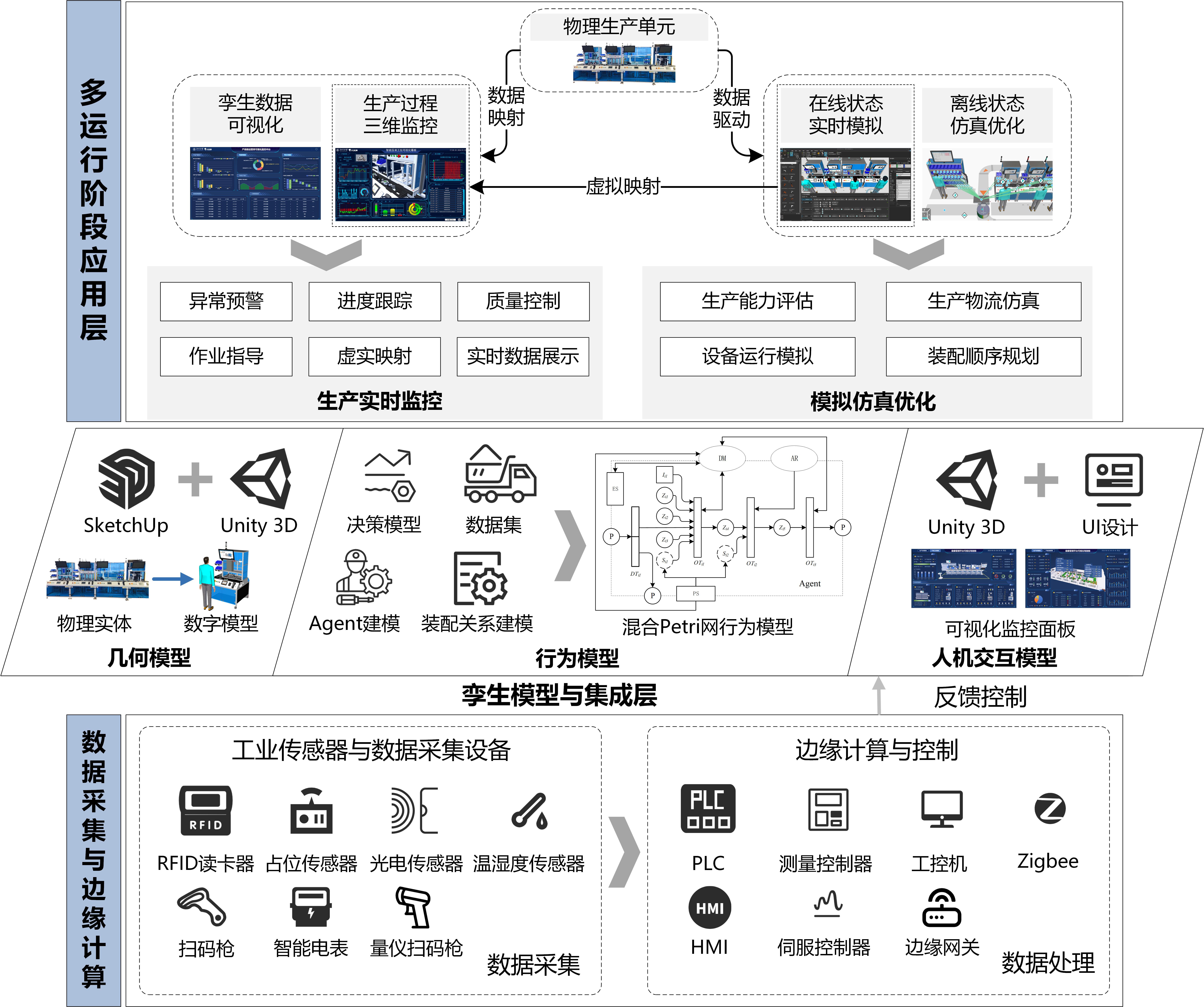 许善坤同学的毕业设计《基于数字孪生的柔性产线虚拟仿真与实时监控系统研究》面向柔性生产系统产前仿真与运行监控两个阶段,提出一种融合几何、行为、人机交互等模型的柔性产线数字孪生系统整体框架与集成建模方法,并重点围绕两个阶段行为逻辑混合建模与快速切换应用需求,提出一种面向多Agent的混合Petri网行为建模方法;通过研究柔性产线数字孪生系统虚实映射技术,实现事件与实时数据驱动的数字孪生系统多阶段快速切换与应用;基于成熟的工业仿真软件与虚拟引擎等开发技术,结合物理验证环境进行原型系统开发与应用验证,该选题锻炼了学生解决实际工程问题以及从工程实践中提炼和研究学术问题的能力。