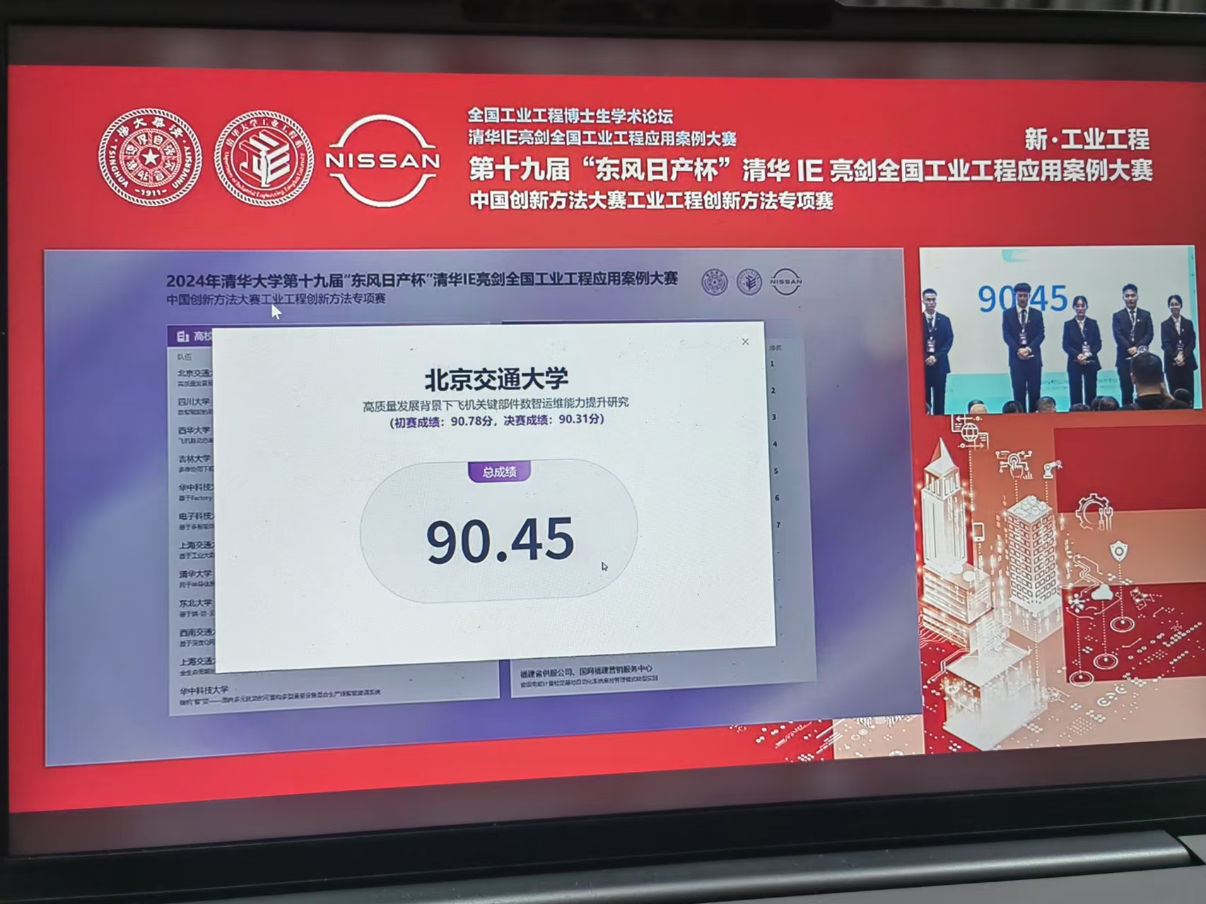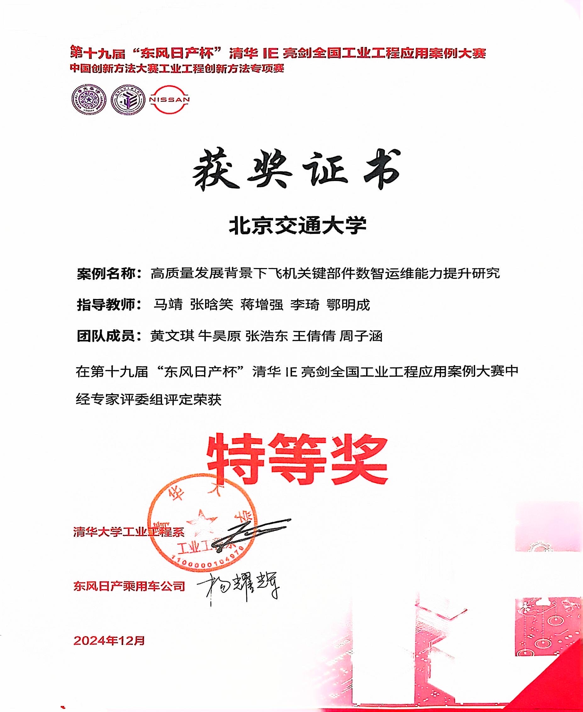 2024年12月8日,“第十九届东风日产杯——清华IE亮剑全国工业工程应用案例大赛暨中国创新方法大赛工业工程创新方法专项赛”在京落下帷幕。在本次大赛中,北京交通大学共有5支队伍参加比赛,最终荣获全国特等奖1项、二等奖2项、三等奖2项。